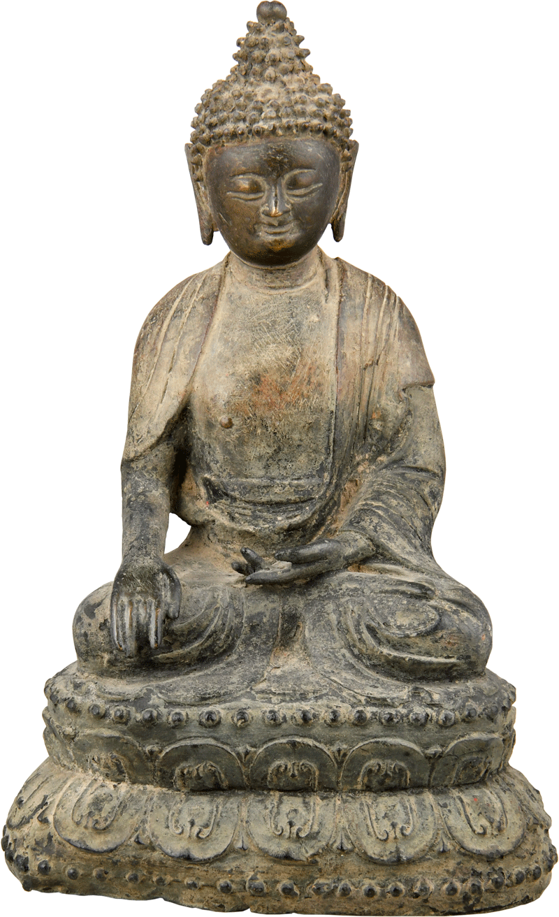 明铜释迦牟尼坐像,高24.5厘米。佛像以精铜铸造,面相丰圆,双目微睁垂视,嘴唇饱满含笑,神态静穆中蕴含慈悲,充分展现了明代佛造像“宽额丰颐、沉静端庄”的审美特征,是中原汉传佛教造像的典型代表。