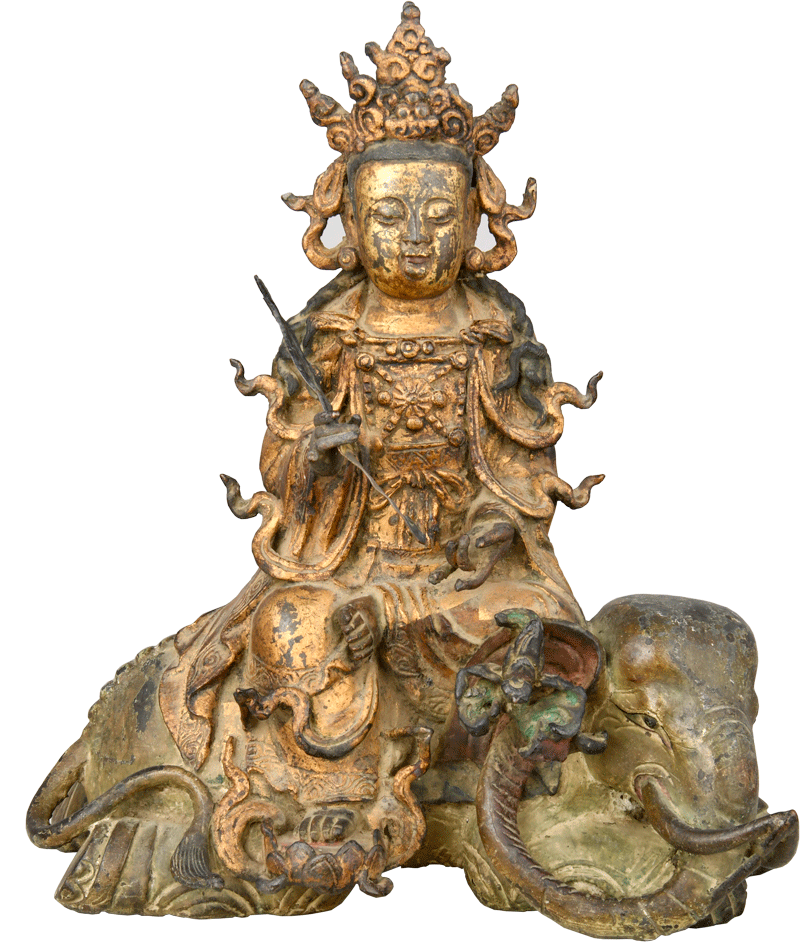 这尊来自榆中县兴隆山的明代鎏金普贤菩萨铜坐像。造像通体鎏金,宝光润泽,展现了明代汉传佛教造像精湛的工艺与独特的审美。