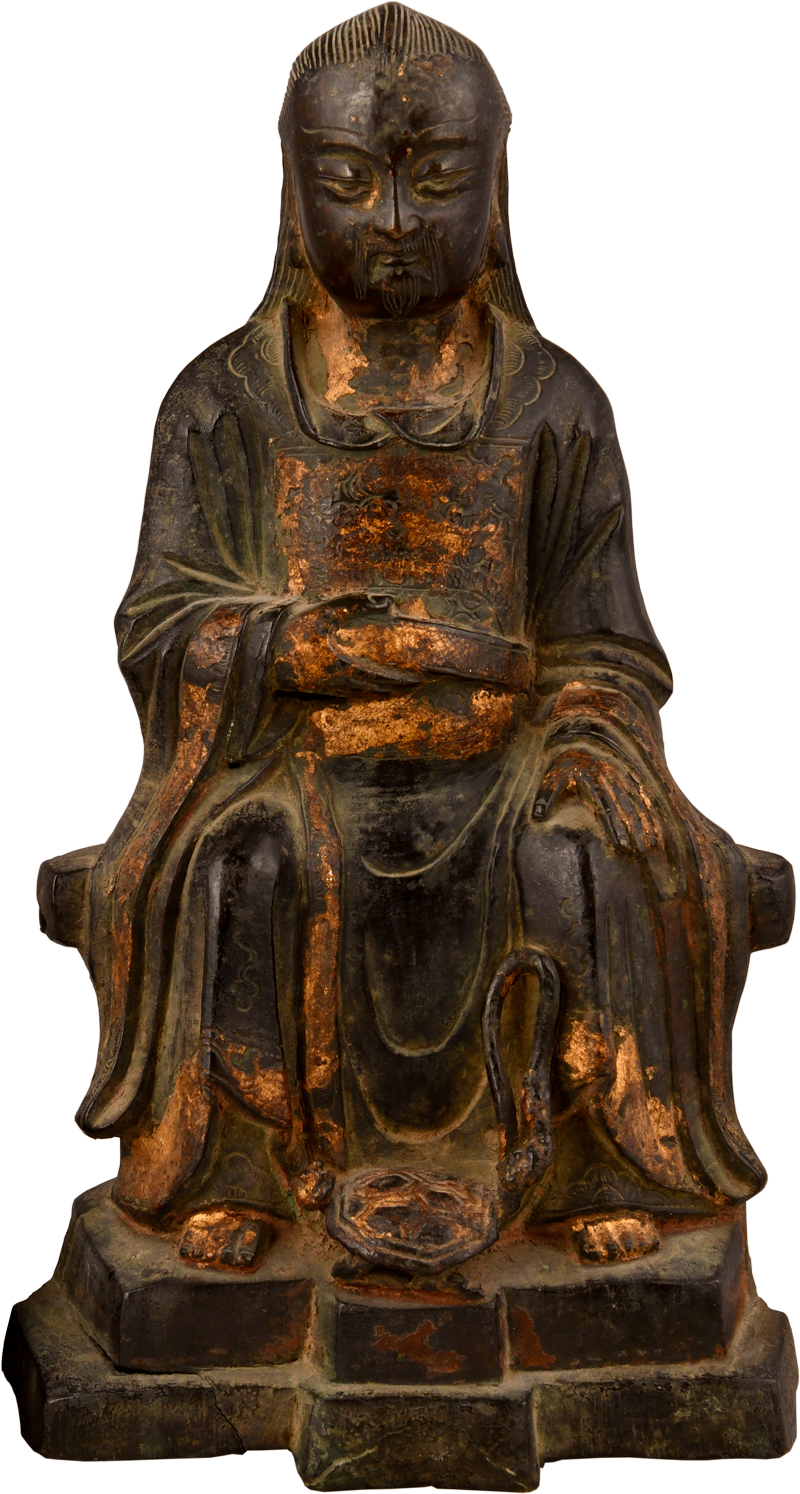 明代玄武祖师铜坐像。通高25厘米,造型古朴沉稳,是一件融合了人格神与动物图腾的明代道教艺术精品。