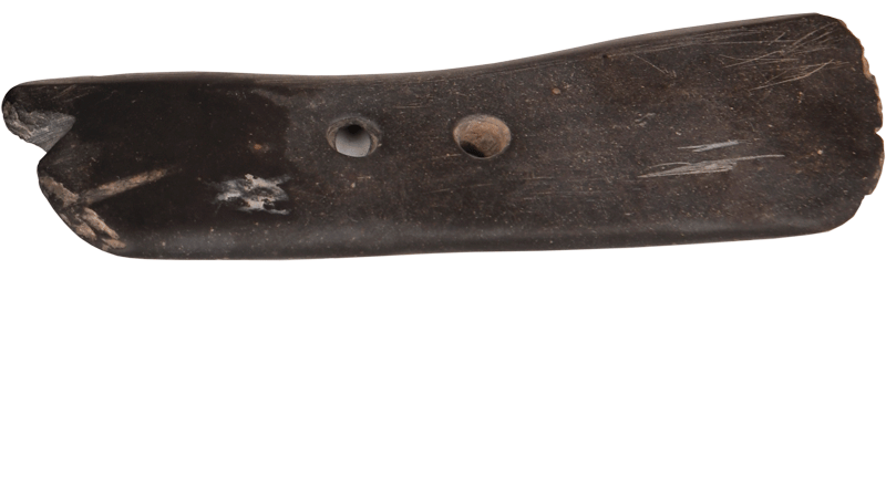 新石器时代石镰,1987年6月出土于榆中县龛谷峡石堡子遗址。长13.3厘米,宽4.5厘米,刀背厚0.3厘米,刀刃厚0.1厘米,刀身中部钻有两孔,刃部较为锋利。石镰由坚硬的青石精心打磨而成,形状呈轻微弯曲状,线条流畅自然,简洁优美,虽然没有华丽的装饰,但却散发着一种古朴原始的美。