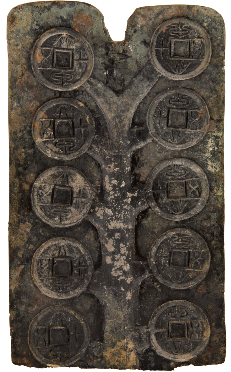 钱范原为一套,这是钱范的面范,还有个素面的背范,在铸造钱币时,将面范与背范合在一起,再将熔化的铜液顺着柄端的浇铸口倒进去,铜液顺着干槽和支槽,流入各个铜钱模。待冷却后,便可取出一枚枚“大泉五十”钱币了。