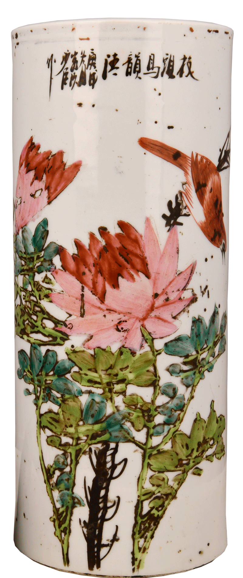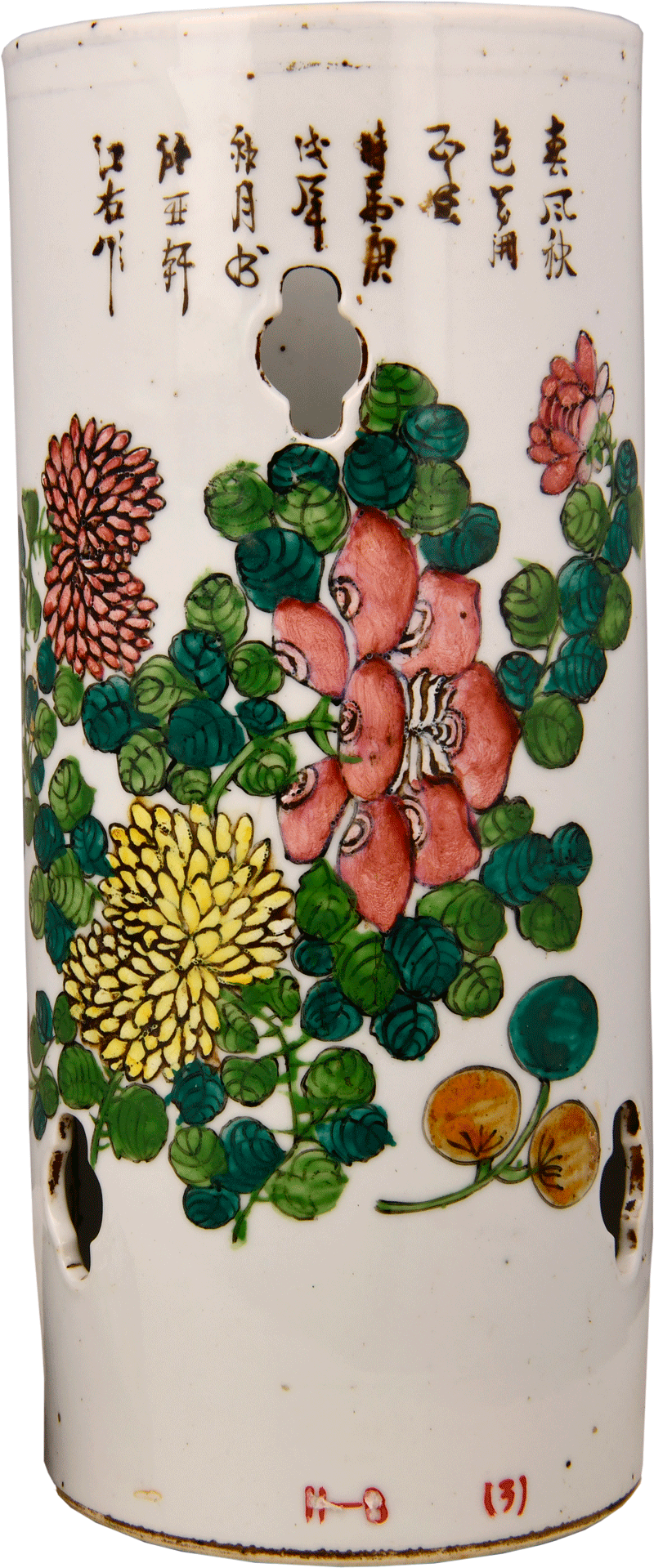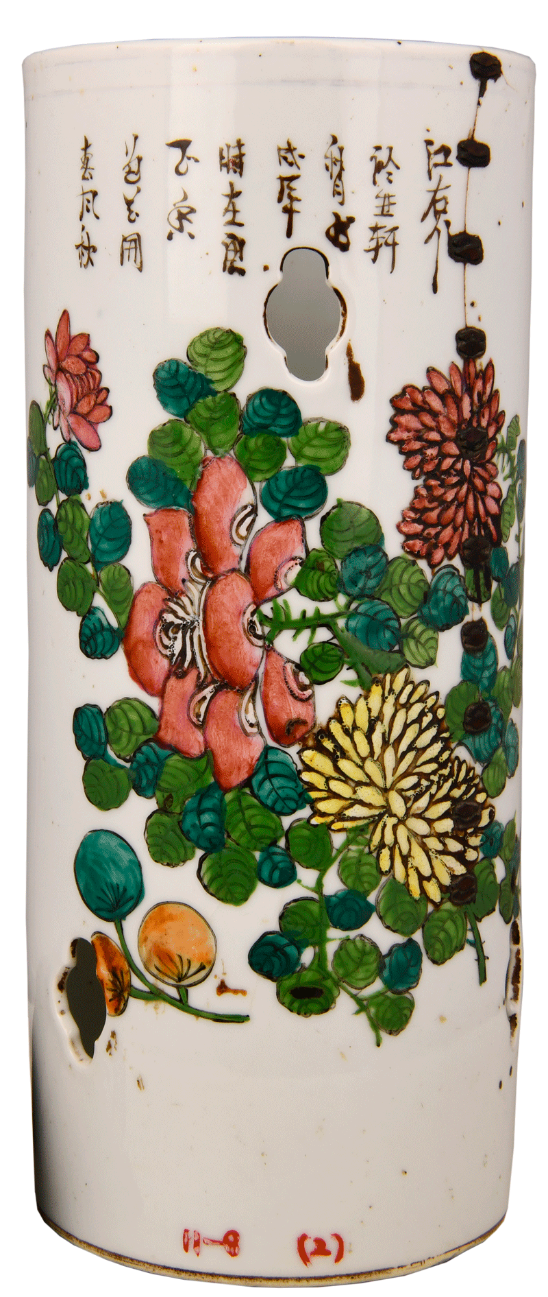 清花鸟纹白瓷釉帽筒,是清代官员放置花翎顶戴用的。通高12厘米,口径7.5厘米,通体着白色釉,釉色温润亮丽,筒壁所绘牡丹花卉雍容华贵,菊花清新雅丽,寓意着美好与吉祥。上部书“春风秋色花开正香——时在庚戌年秋月书于亚轩江右作”。筒壁有六个等距上下相交错的海棠花形镂孔,是为了便于散去帽子里的汗气,帽筒里面也可以放置香料。