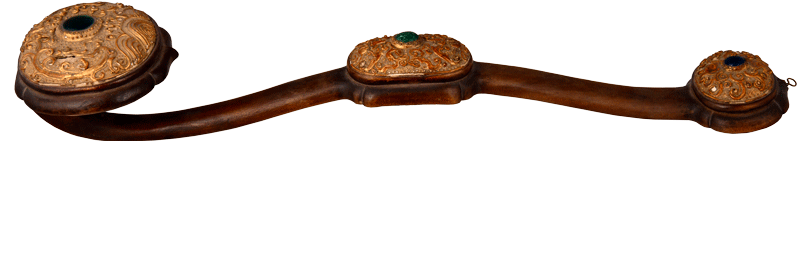 清代木镶嵌宝石如意,1980年从青城镇征集。长50厘米、高7厘米,木质,流线型身姿。柄微微弯曲,宛如灵芝,浮雕佛手、石榴、寿桃等吉祥图案,并镶嵌两颗绿宝石,一颗蓝宝石,华美璀璨,令人赞叹。