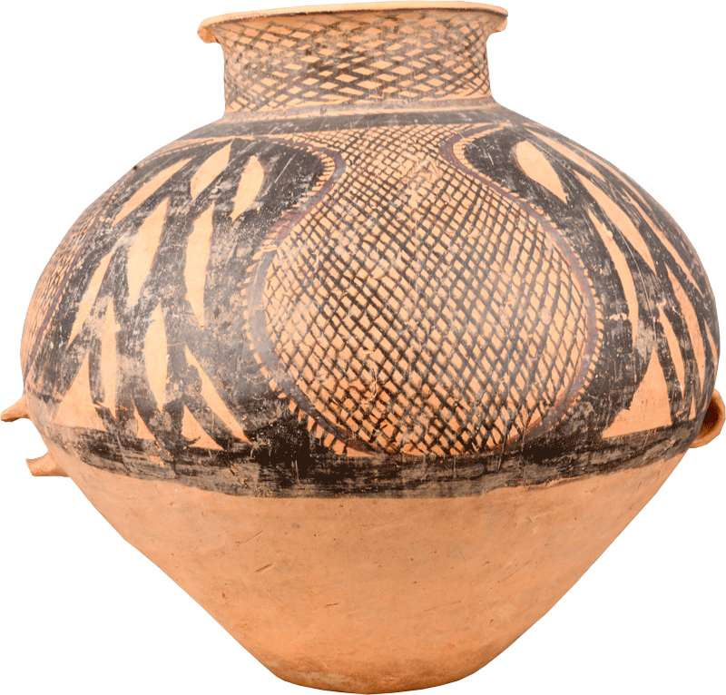 葫芦网格纹属于半山文化的典型装饰纹饰,细密整齐的网格纹,层层叠叠、上下交错、秩序井然,它让我们再次感受到了“江南可采莲,莲叶何田田”的意境,透着充满希望的田园诗意。它圆圆的形状正如孕妇的肚子,是新生命的孕育之所。“葫芦”谐音福禄,在中国传统文化中象征福禄双全的美好寓意,葫芦藤蔓绵延,果实累累,有着多子多福的寓意,原始先民把葫芦绘在陶器上面,表达了他们祈求人丁兴旺的美好愿望。在古代神话中,它是太上老君的炼丹神器,八仙铁拐里的武器,悟空收妖时的利器。