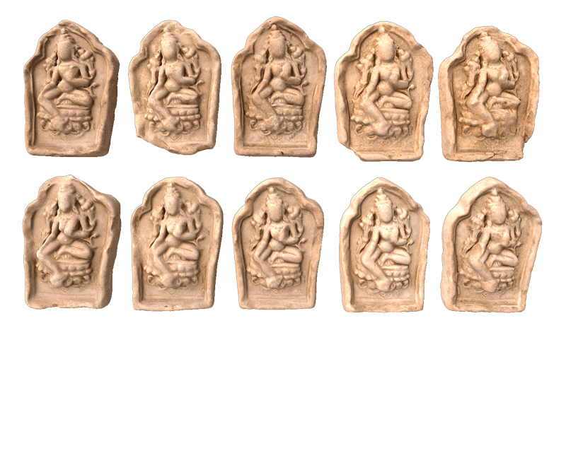 榆中县博物馆馆藏10件清绿度母造像善业泥,每件长9厘米,宽6厘米,厚2.5厘米。正面造型为绿度母,绿度母头戴花冠,面部丰满,上身饰缨络,下着薄裙,左舒坐于仰覆莲台座上,右脚踩莲花,两肩生莲,右手扶膝,左手上举,形象雍容华贵,美丽慈祥。龛背均有梵文。度母,全称圣救度佛母,是藏传佛教中普渡众生的女菩萨。由观世音菩萨化现而来的度母共有21种,其中最负盛名、广受崇奉的是绿度母与白度母。