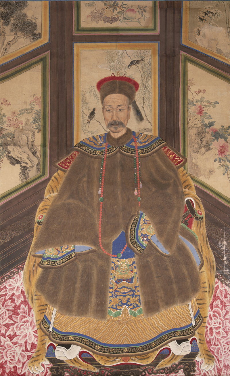 周士俊画像,画高152厘米,宽82厘米,画面中周士俊正襟危坐于屏风前,头戴冬冠,双眉微微抬起,额上显出浅浅的皱纹,双目平视前方,鼻梁瘦挺,上下唇有少量髭髯,脖颈处戴着与其身份相符的朝珠,内穿官服,外罩虎皮大氅,脚蹬长筒黑靴,神态端庄,仪态大方。